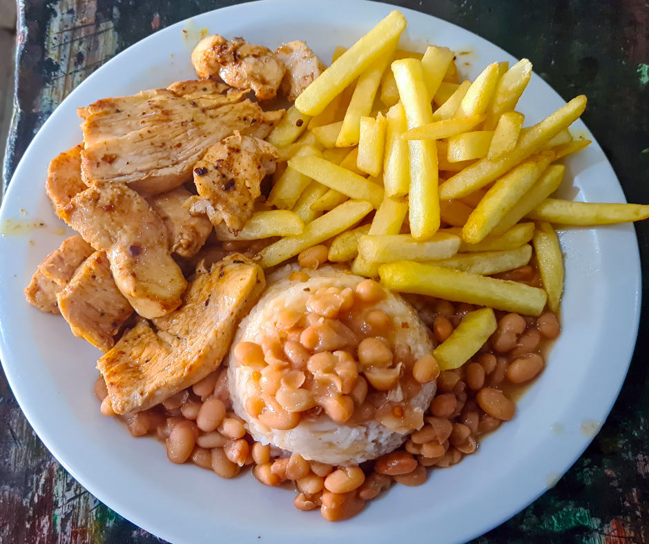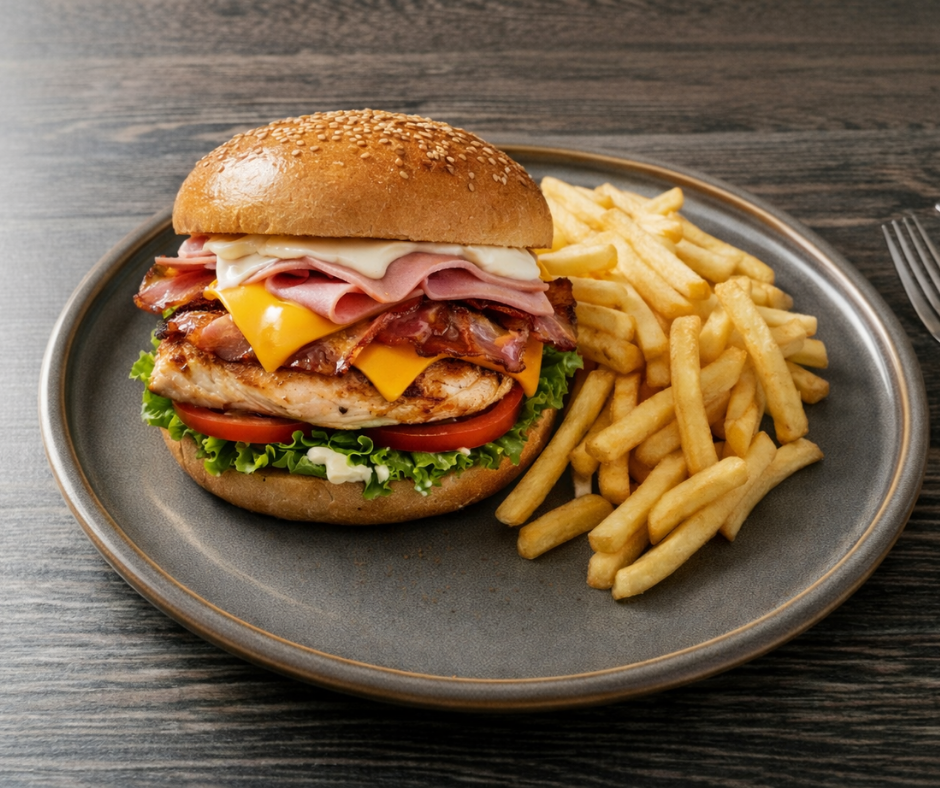 X-Frango $14.75 Frango grelhado, presunto, cheddar, bacon, alface, tomate e maionese. Com batata frita.