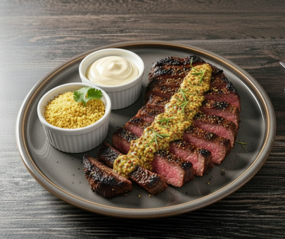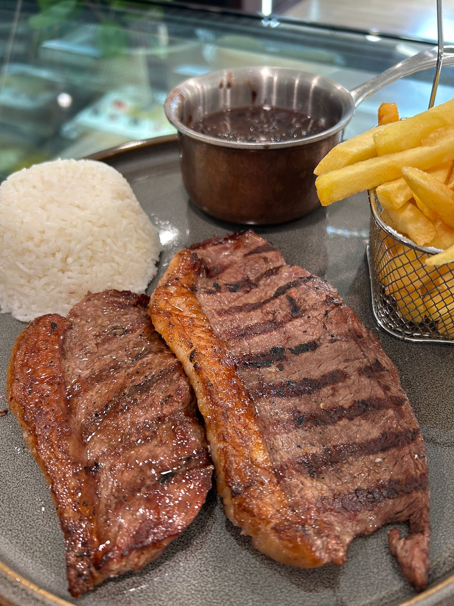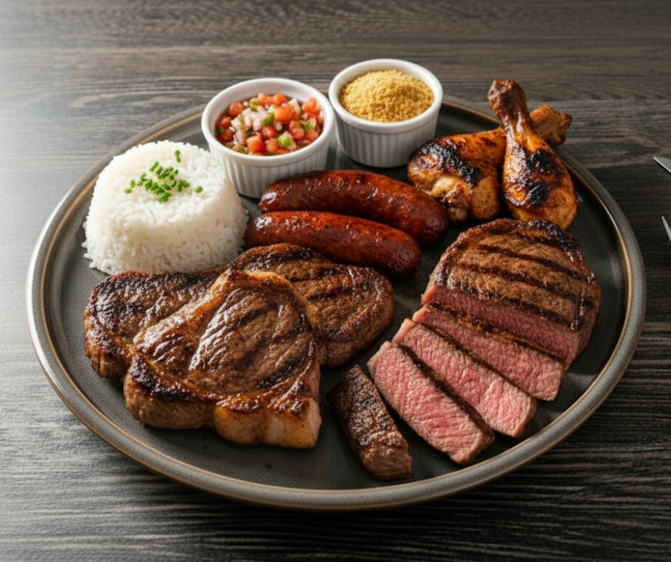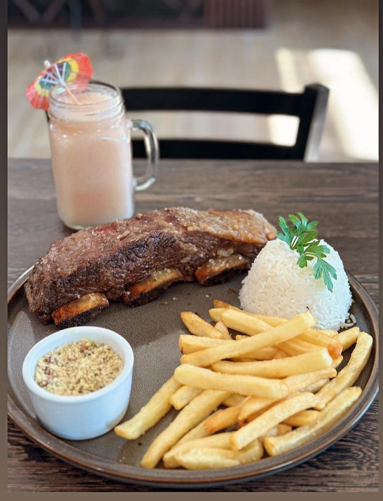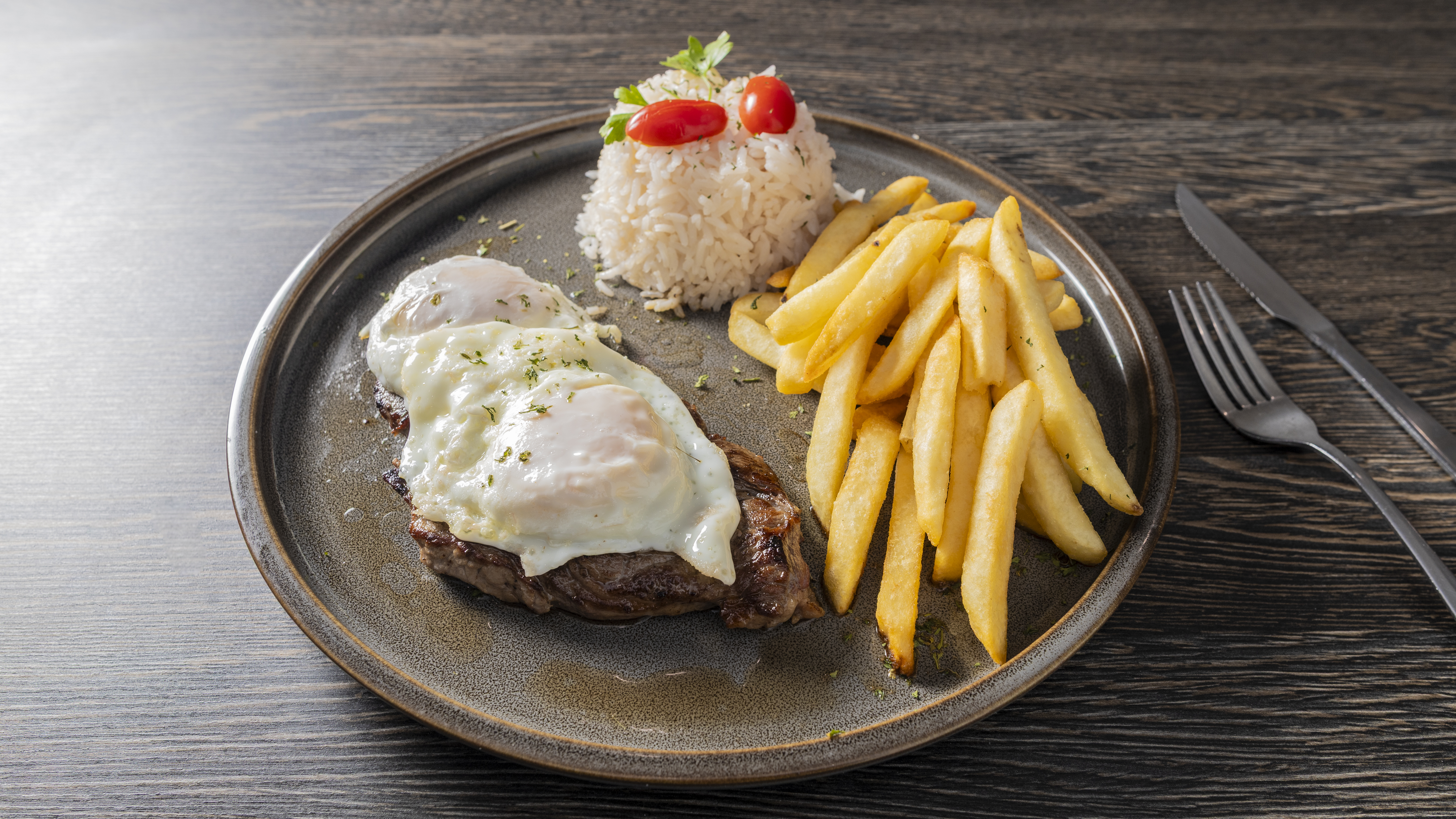 Aroma Burger $16.75 Alcatra grelhada, 2 fatias presunto, 2 fatias de queijo Prato, alface, tomate, cebola e maioneseSteak. Acompanha batatas fritas.