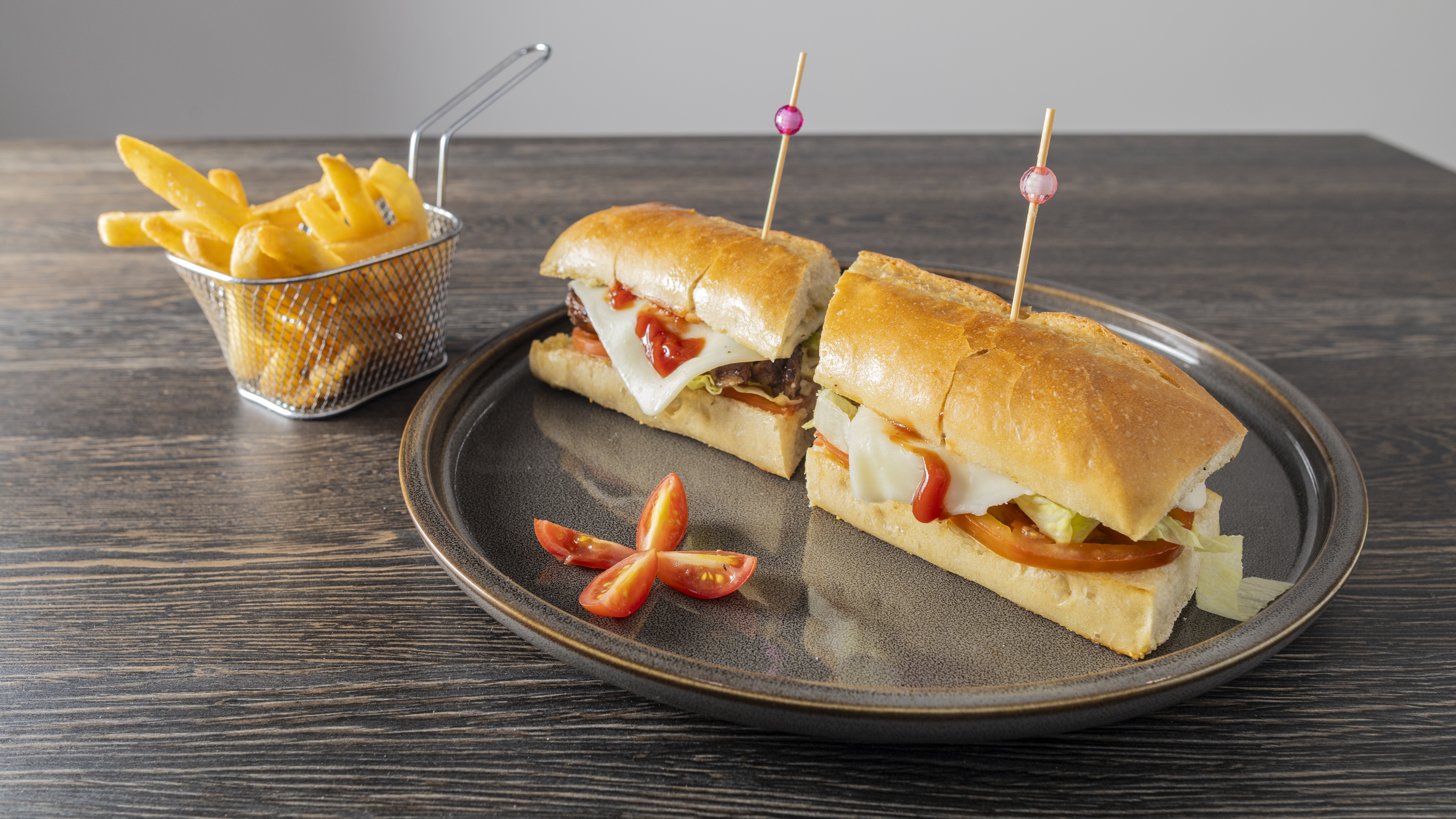 Aroma Português $8.25 Pão Português, 2 fatias de Presunto e 2 de queijo, bacon, alface, tomate e maionese.